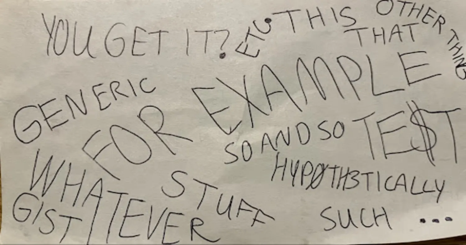 Start by writing the wordcloud you want. For my example, I wrote a bunch of generic terms that popped into my head like “example” and “whatever.” If you can’t think of the words you want, you can always generate a short list with Gemini. Vary the direction and size of the writing to make the final image more visually interesting.