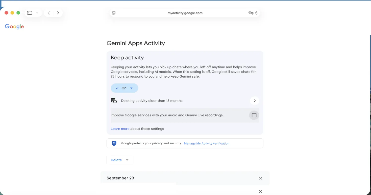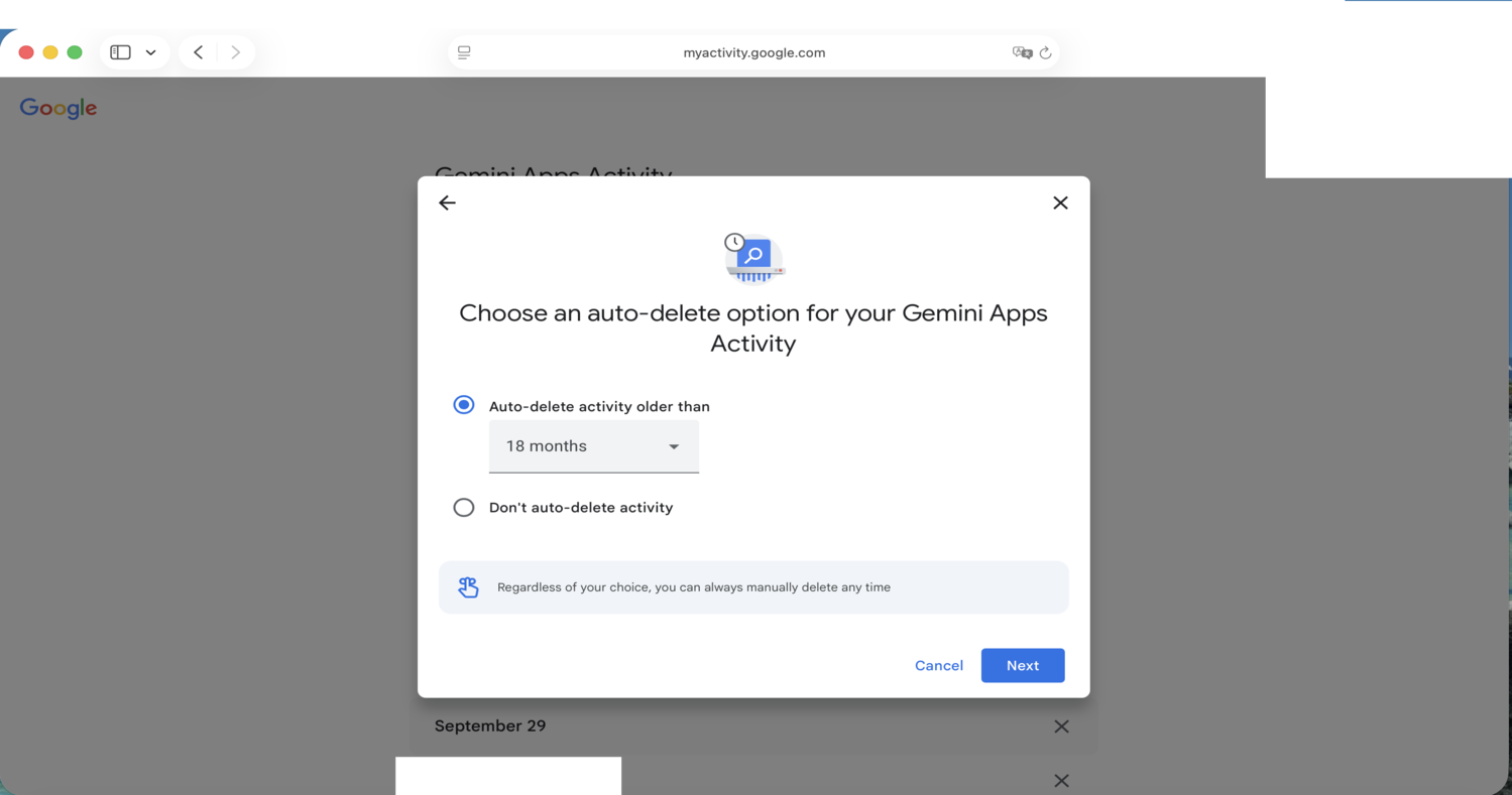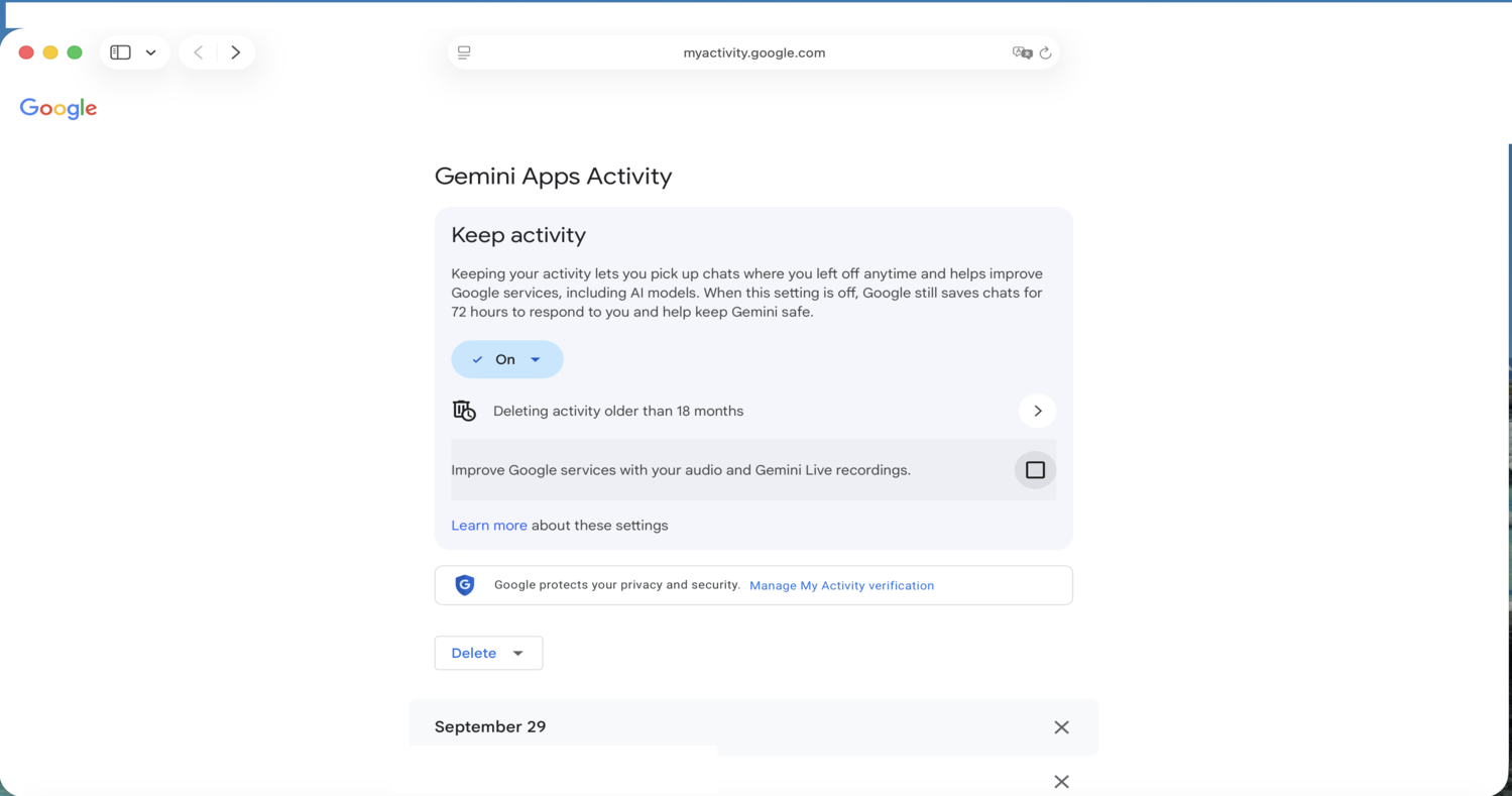- Configure data retention and auto-deletion, which is necessary to avoid training on your conversations with Gemini. (Euphemistically: “your activity…helps improve Google services, including AI models”).