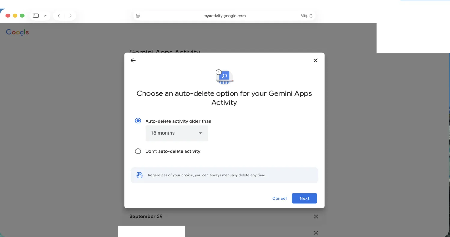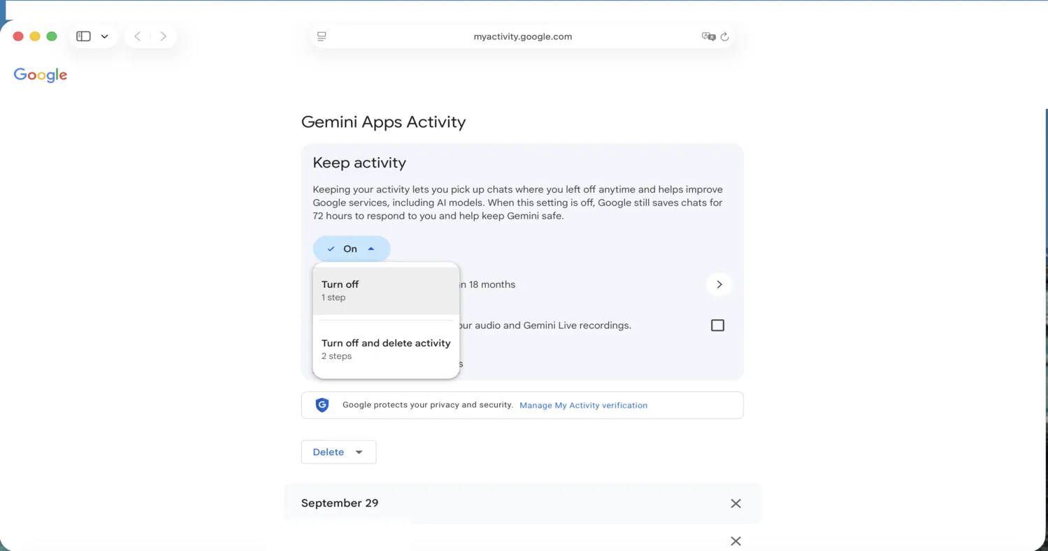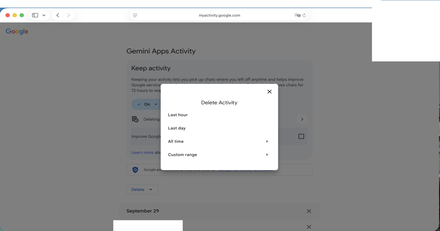 Click the Gear symbol for Settings, then Activity (on mobile, it’s “Gemini Apps Activity”). Click the words “Deleting activity older than [time period]” to adjust the retention period for older conversations. This does not mitigate concerns about Google training on your data, but may protect the data in the event of an account takeover.