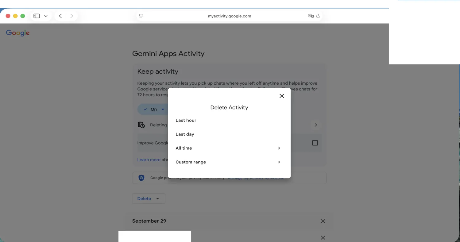 You may want to keep records of the previous searches you have conducted for ongoing research or to revisit what went wrong if there were issues with a citation. However, by choosing to “Keep activity,” Google notes that “your activity…helps improve Google services, including AI models.”