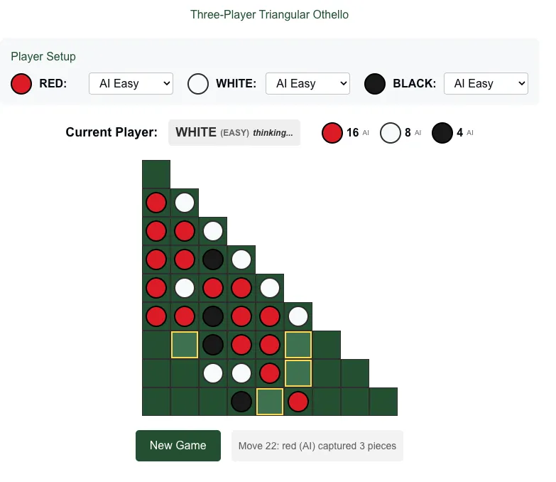 My kids and I play board games a lot. Sometimes I try out ideas with Claude Artifacts. One idea that got a lot of use was when I made a three-player version of Reversi I came up with to play with my sons.